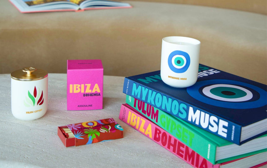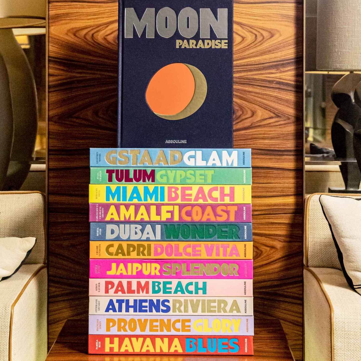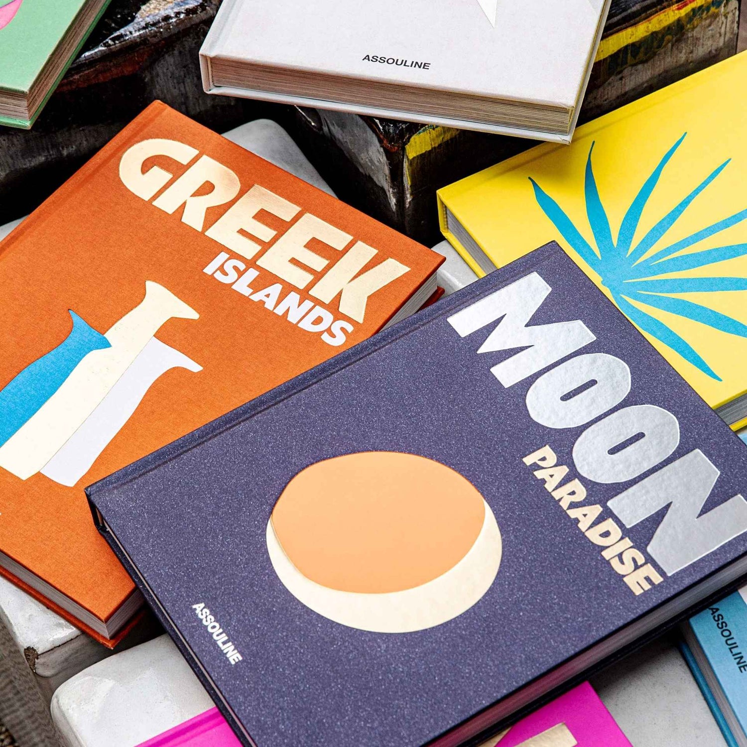 Die Basis legen: Beginne dafür immer mit dem größten und schwersten Band als stabilem, visuellen Fundament. Ein opulenter Reisebildband aus der Travel Series von Assouline, wie das leuchtend blaue „Mykonos Muse“ oder das sonnengelbe „Capri Dolce Vita“, eignet sich hierfür perfekt. Dieser erste Band setzt das Farbthema und den emotionalen Ton für das gesamte Arrangement.