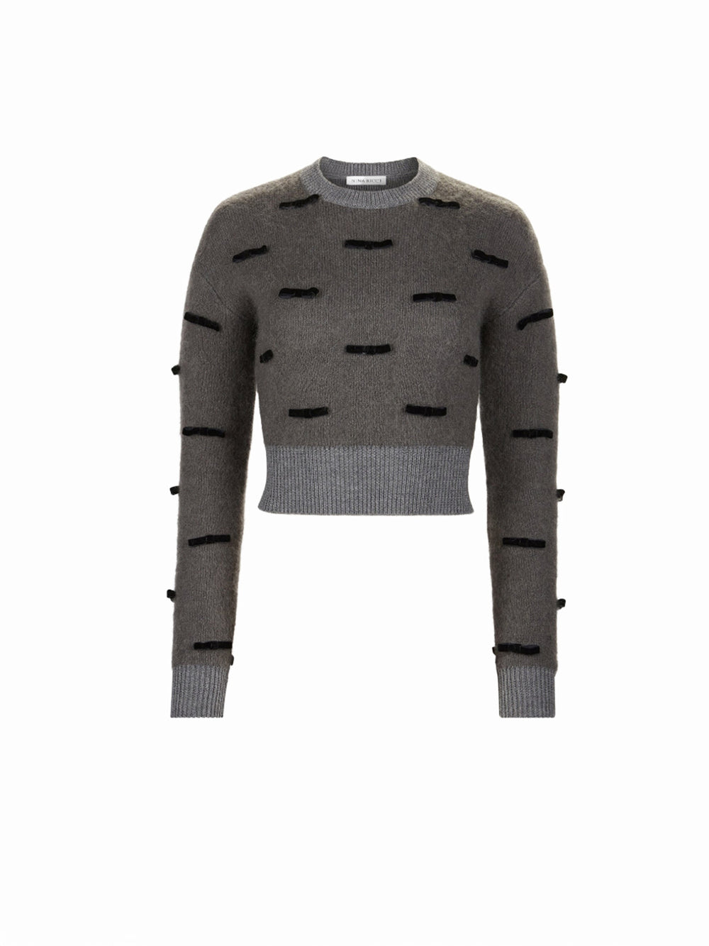 This mohair-wool blend sweater is decorated with hand-embroidered bows and has comfortable ribbed cuffs.