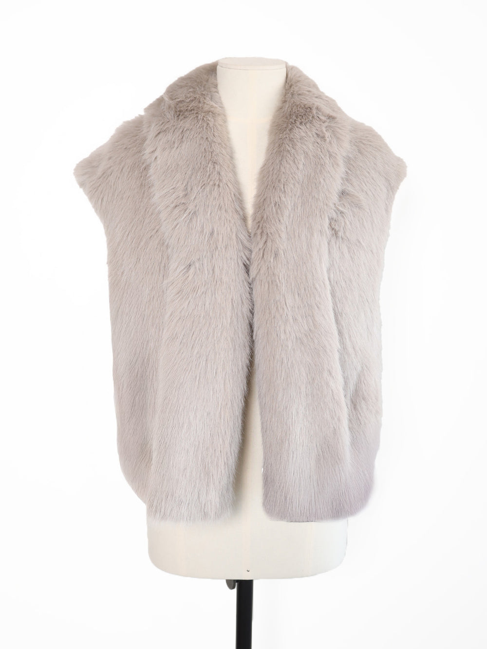This sleeveless faux fur vest has a loose fit, a shawl collar, a hook-and-eye closure, and side pockets. It can be mixed and matched in countless ways.