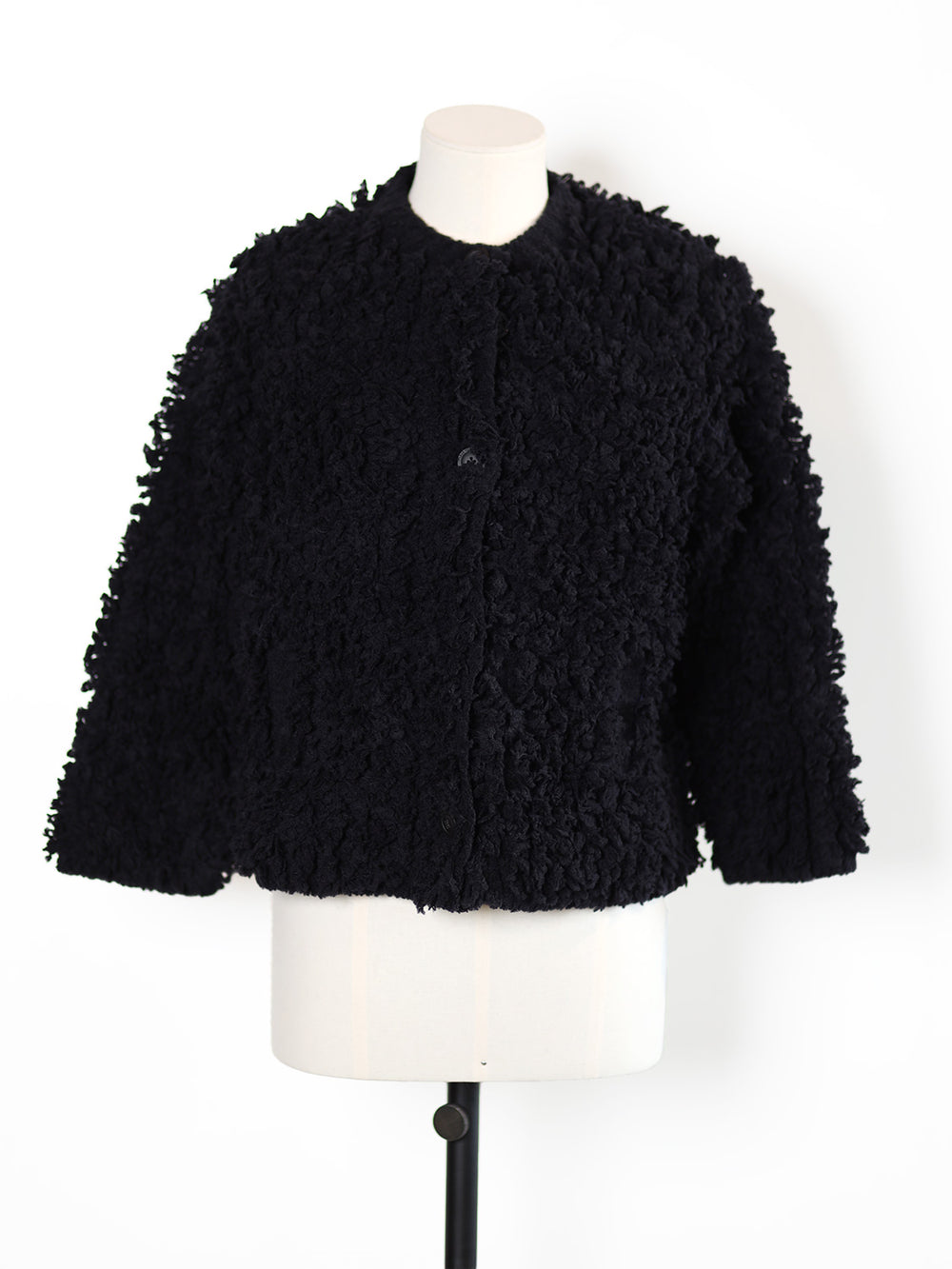 Cette veste en laine allie une matière chaude à une élégance sobre. Elle présente une encolure ronde et une patte de boutonnage classique.