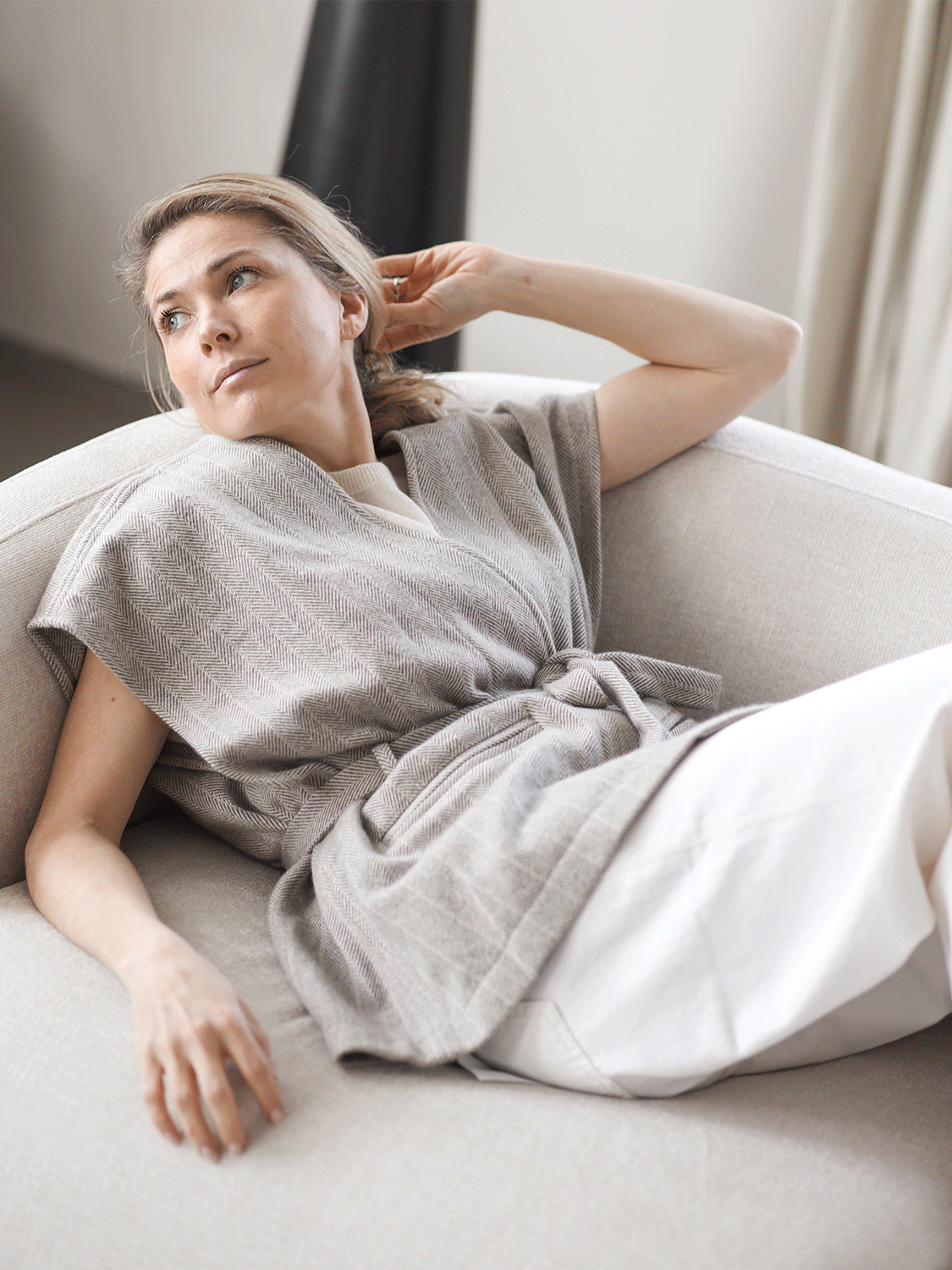 Die Weste Moon überzeugt mit ihrem eleganten Herringbone Muster und einer hochwertigen Cashmere Blend Qualität. Die weiche, edle Struktur verleiht dem Modell eine luxuriöse Haptik, während der lockere Schnitt mit Bindegürtel eine moderne, feminine Silhouette formt. Ob offen getragen oder lässig gebunden – dieses Piece verbindet zeitlose Raffinesse mit entspanntem Chic und macht jedes Outfit stilvoll komplett.