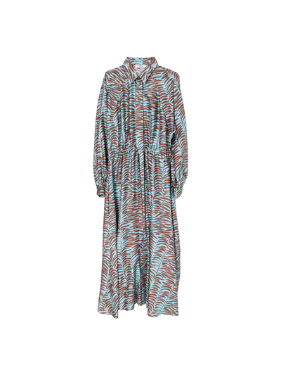 Ein gemustertes Maxikleid aus 100% Seide im Loose Fit. Das Zebra-Muster, Schluppen-Detail und die seitlichen Eingrifftaschen verleihen diesem Kleid eine elegante und moderne Note.