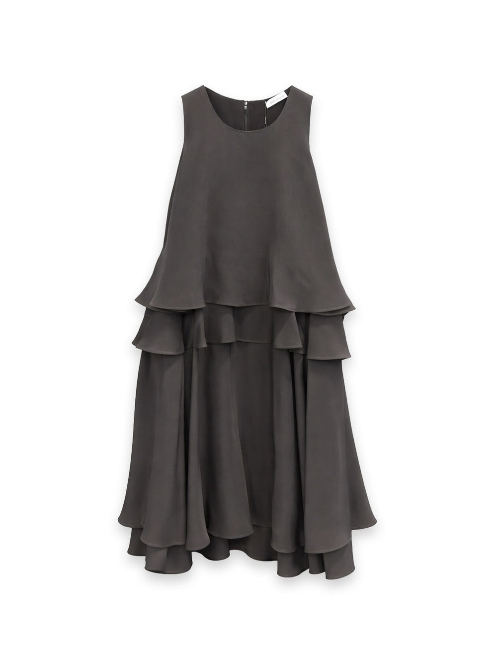 Fließendes, ärmelloses Kleid in edlem Anthrazit mit femininem Volant-Design. Der locker fallende Schnitt und die feinen, gestuften Lagen verleihen dem Kleid eine leichte Bewegung und elegante Tiefe. Der schlichte Rundhalsausschnitt sorgt für eine moderne Silhouette, während das weich fließende Material einen besonders angenehmen Tragekomfort bietet. Ein stilvolles Piece für besondere Anlässe, Dinner oder elegante Everyday-Looks.