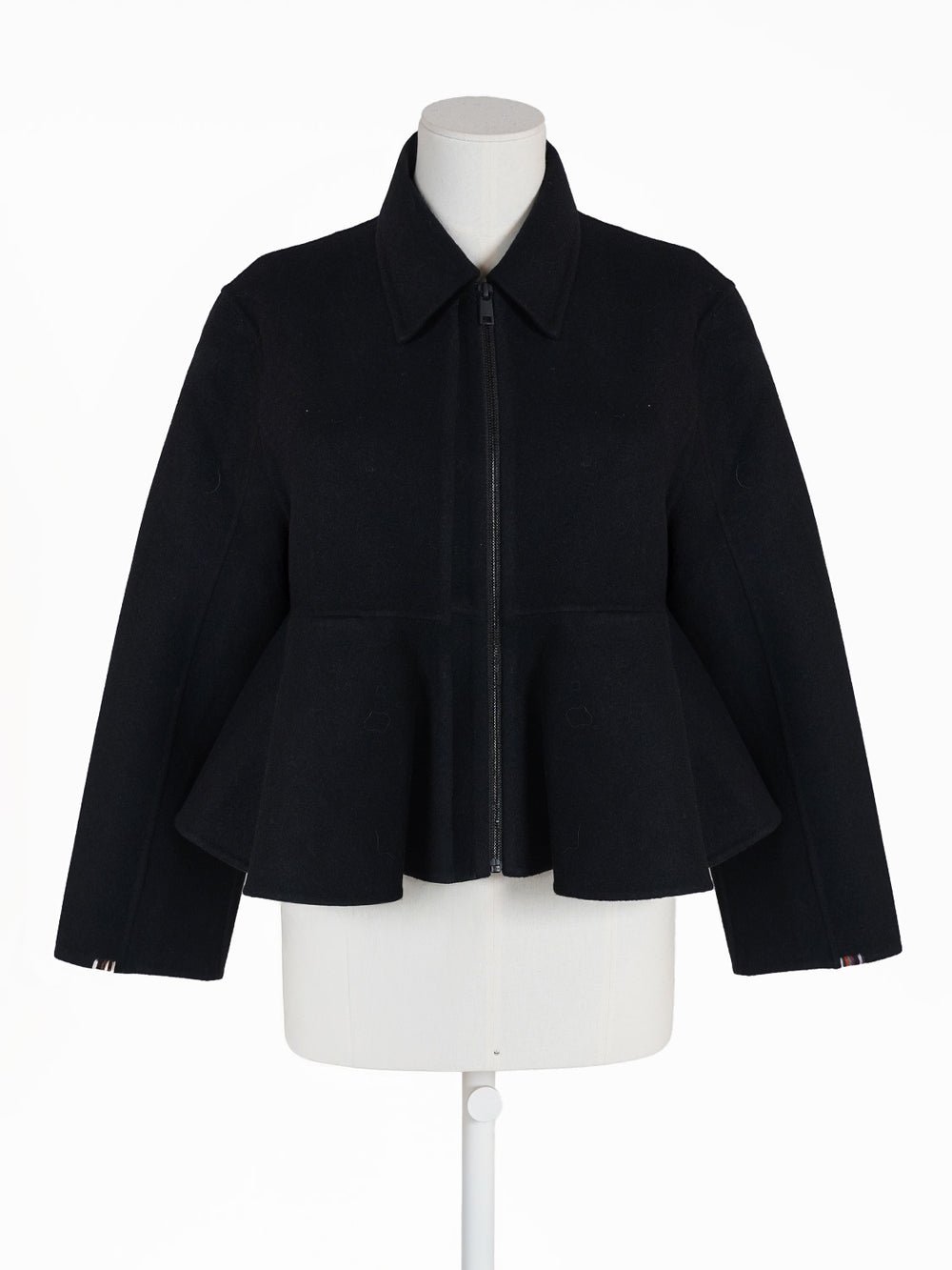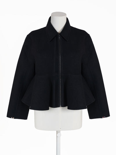 Die Jacke aus Wolle und Cashmere ist locker geschnitten und hat einen Hemdkragen. Sie wird mit Reißverschluss geschlossen und ist mit einem Volant verziert.