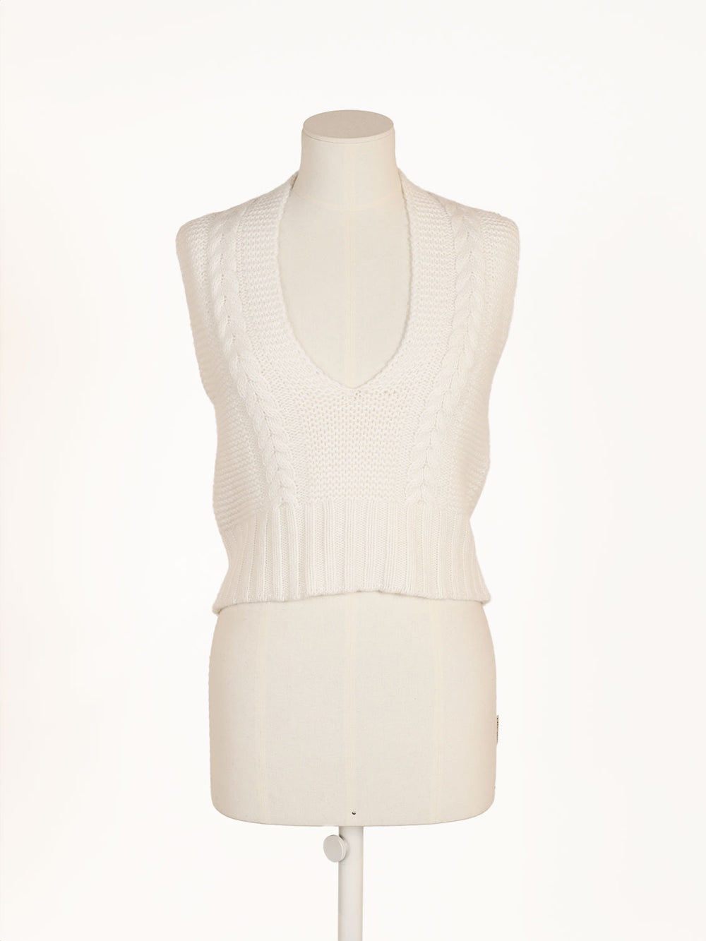 Der Pullunder Sallie ist mit einem tiefen V-Ausschnitt gearbeitet und zeigt ein markantes Zopfmuster. Der körpernahe Schnitt und die ärmellose Ausführung betonen die klare Form. Die gleichmäßige Strickstruktur verleiht dem Modell Tiefe und Ausdruck. Durch den präzisen Schnitt entsteht eine kompakte Silhouette mit klarer Linienführung.