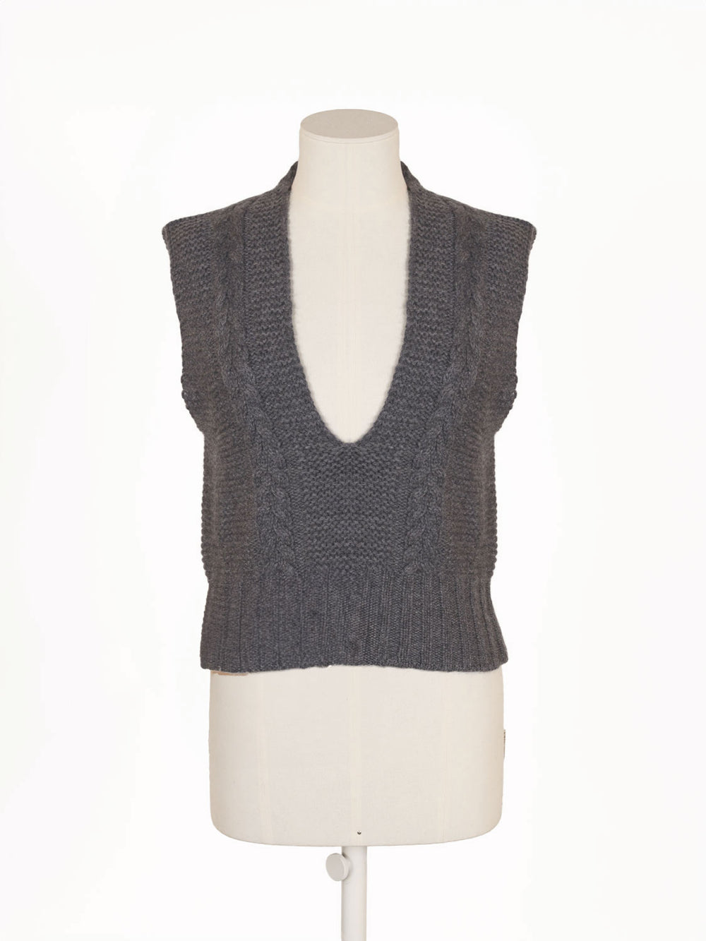Der Pullunder Sallie ist mit einem tiefen V-Ausschnitt gearbeitet und zeigt ein markantes Zopfmuster. Der körpernahe Schnitt und die ärmellose Ausführung betonen die klare Form. Die gleichmäßige Strickstruktur verleiht dem Modell Tiefe und Ausdruck. Durch den präzisen Schnitt entsteht eine kompakte Silhouette mit klarer Linienführung.
