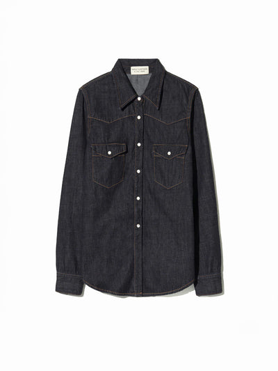 Diese Jeansbluse hat einen spitzen Kragen, Druckknöpfe, aufgesetzte Brusttaschen, Kontrastnähte und eine spitze Passe im Rücken.